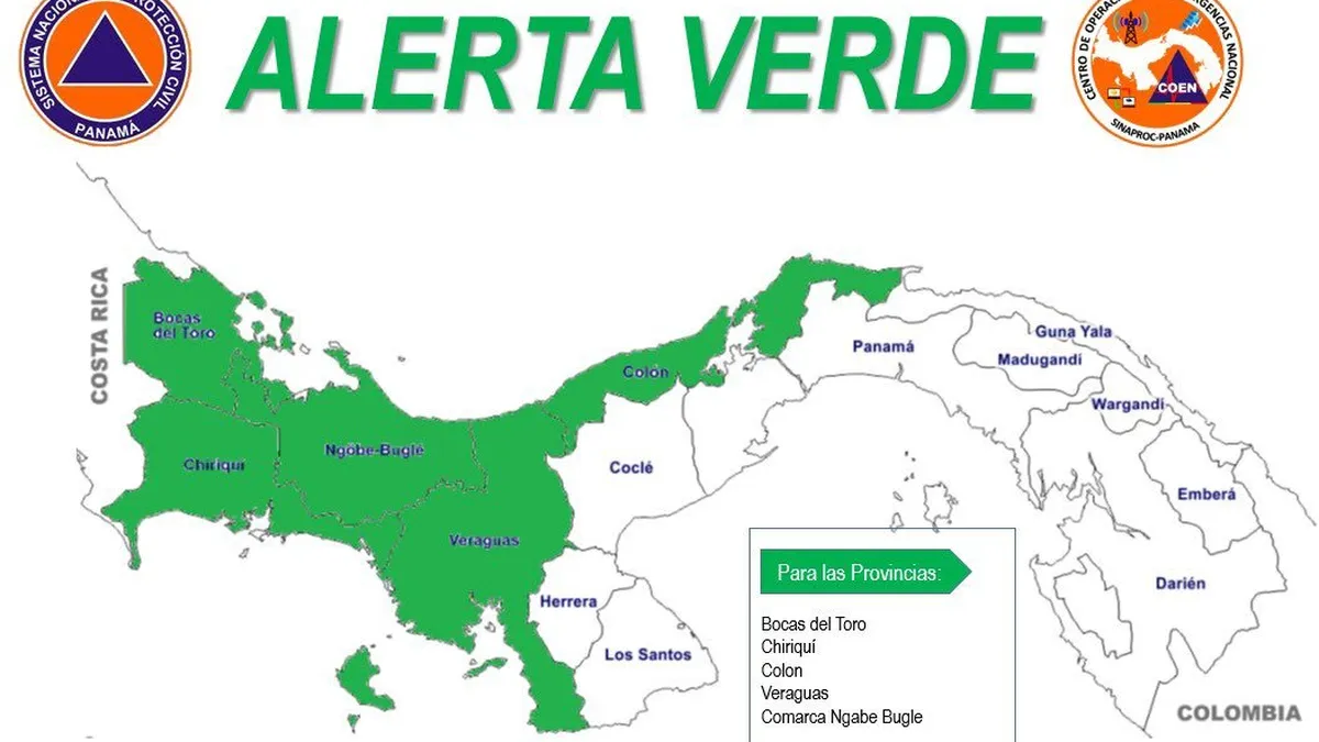 El Sistema Nacional de Protección Civil (Sinaproc) decretó este lunes 16 de julio Alerta Verde para Chiriquí, Bocas del Toro, Veraguas, Colón y la Comarca Ngäbe Buglé y manutvo un aviso de prevención por el paso de la Onda Tropical 18.
