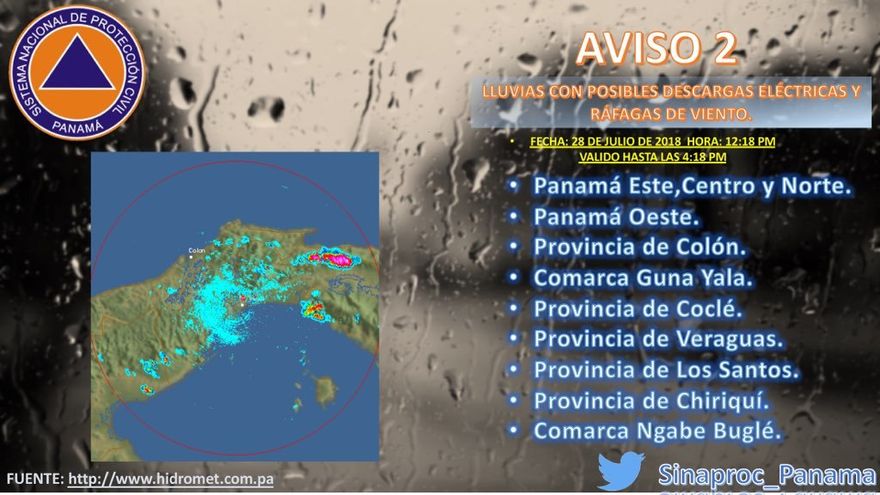El aviso será válidos hasta las 4:18 de la tarde para Panamá Este, Centro y Norte; Panamá Oeste; Colón; Coclé; Veraguas; Los Santos; Chiriquí; comarca Guna Yala; y comarca Ngäbe Buglé.