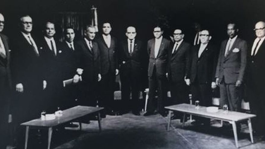 Inauguración de Canal 2 de televisión, el 23 de abril de 1962. De izq. a derecha, Alejandro Remón Cantera, Max del Valle, Gilberto Arias, Fabían Curro Velarde, Marcos Robles, Mario Velásquez, Roberto F. Chiari, Rodolfo Lindy Paredes, Alfredo Ramírez, Galileo Solís, Juan Felipe Escobar y Sergio González Ruíz. / Cortesía TVN