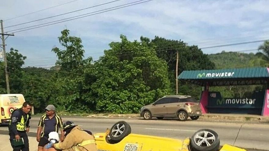 En una fotografía del accidente se observa cómo el vehículo taxi involucrado en el accidente quedó volteado en la cuneta que divide los carriles hacia la ciudad y hacia el interior.
