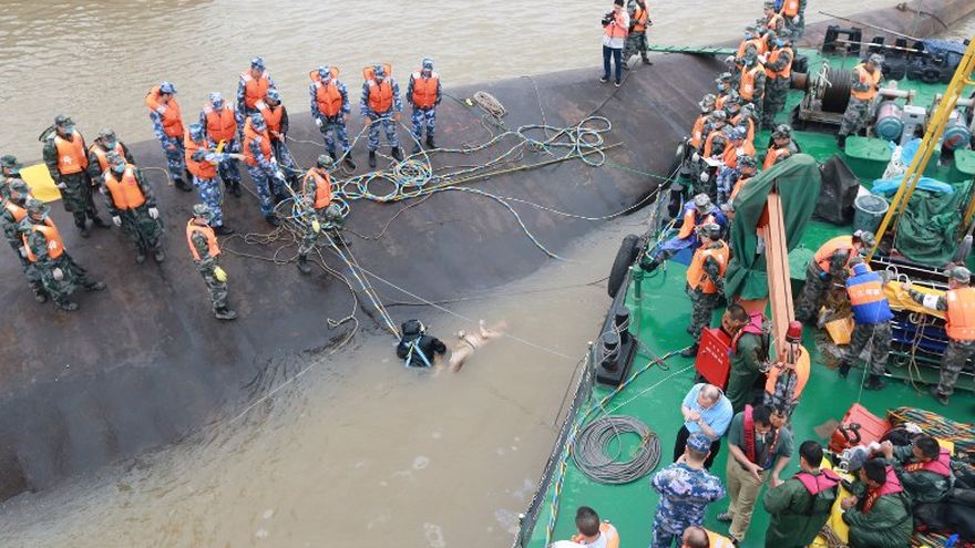 En el lugar del naufragio, bajo una lluvia intensa, los equipos de rescate con el apoyo de un centenar de buzos continuaban registrando el casco del "Dongfangzhixing" ("Estrella de oriente"), que se hundió a 15 metros de profundidad.