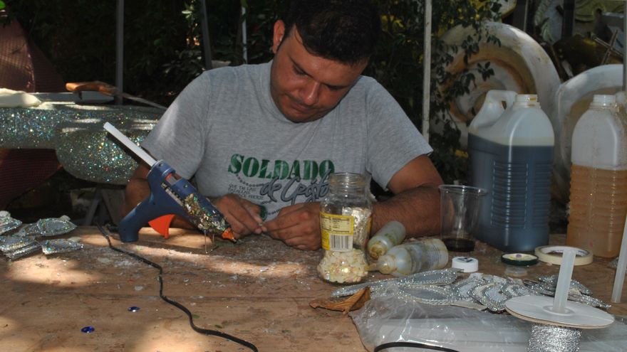 En el taller de Roberto pudimos encontrar un grupo de personas trabajando arduamente en los trajes, carros alegóricos y vestidos de noche.