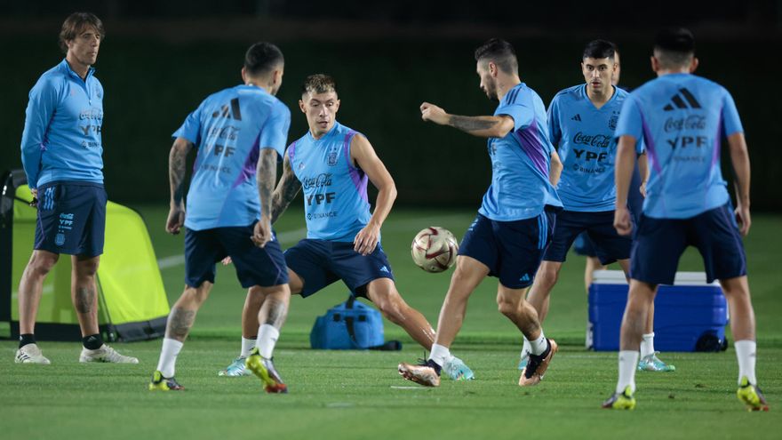 Luego preparó un 4-3-3 con Dibu Martínez, Montiel, Cuti Romero, Otamendi, Acuña, De Paul, Enzo Fernández, Mac Allister, Messi, Julián Alvarez y Di María.