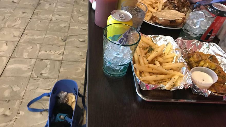 Tuve una amena tarde junto a mi mejor amigo y Sam quien también tomó sus alimentos (bolitas) y agua mientras yo degusté alitas con unas deliciosas papitas fritas.
