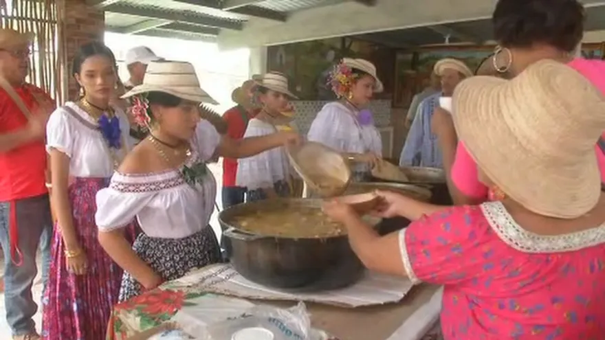 Personas vestidas con atuendos típicos sirven el guacho en totumas