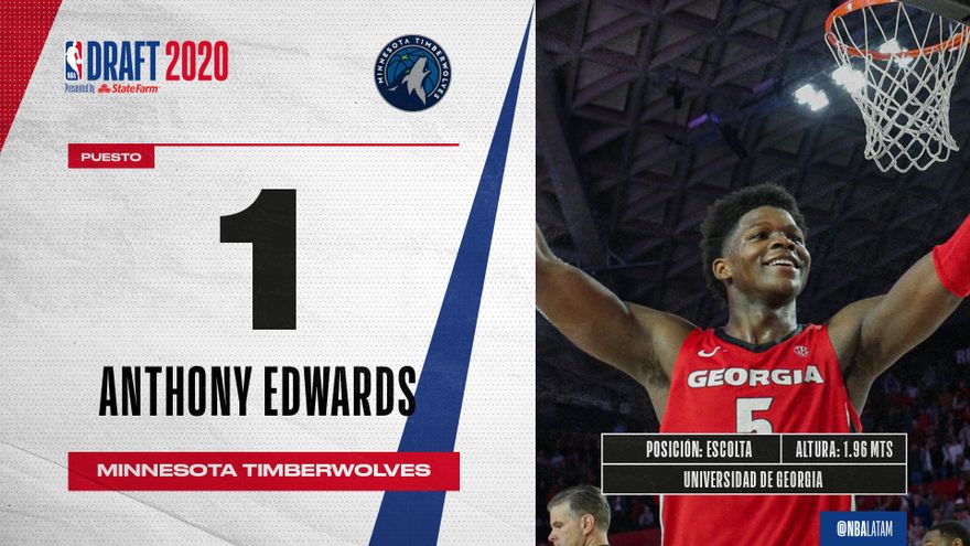 Los Minnesota Timberwolves escogieron este miércoles al escolta Anthony Edwards con el número 1 del Draft de la NBA, anunció el comisionado Adam Silver al comienzo de esta ceremonia que por primera vez se lleva a cabo de forma virtual.