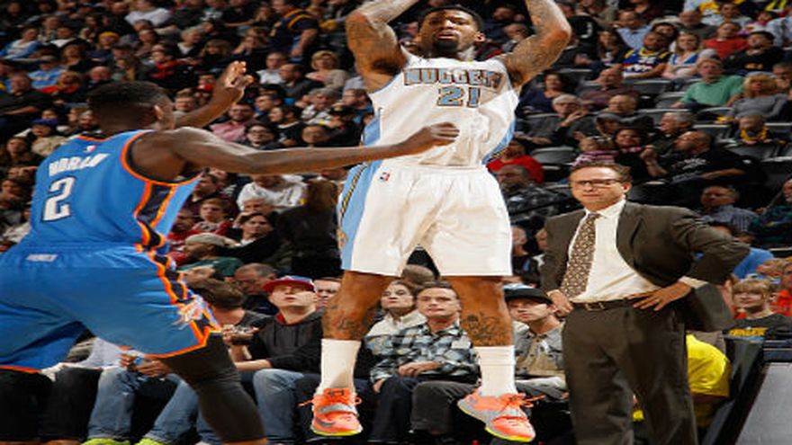 Wilson Chandler contribuyó con 21 puntos, incluido un triple clave en las postrimerías del encuentro, para que los Nuggets de Denver se impusieran el miércoles 107-100 al Thunder de Oklahoma City. Timofrey Mozgov sumó 17 unidades, su mejor estadística de la temporada, para ayudar a los Nuggets. Ty Lawson añadió 15 tantos y el mismo número de asistencias por Denver, que volvió a casa tras una gira con foja de 2-1, incluida una victoria sobre LeBron James y los Cavaliers de Cleveland. Serge Ibaka abonó 22 puntos y 13 rebotes a la cuenta de Oklahoma City. Kevin Durant, quien sufre la fractura del pie derecho, y Russell Westbrook, quien se rompió un hueso de la mano derecha, vieron el partido desde la banca, vestidos con elegantes trajes. El Thunder ha perdido cuatro duelos al hilo, incluido el del martes por la noche en Utah.