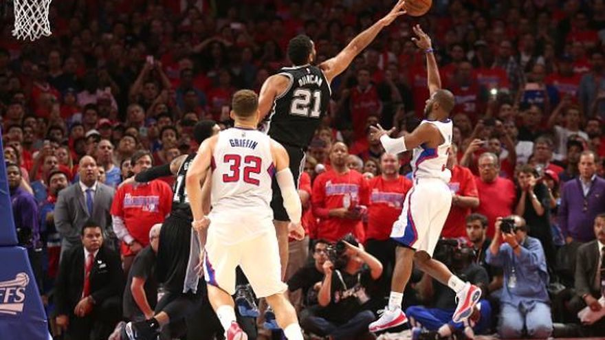 Luego que Duncan encestó dos tiros libres para empatar el juego con 8,8 segundos restantes, Paul atacó por el lado derecho y realizó un tiro a una mano sobre la estrella de 39 años de los Spurs que cayó mientras el base de los Clippers se retiraba de espaldas.