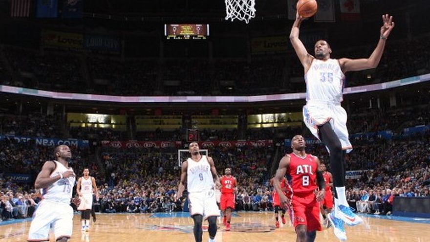 Kevin Durant jugó el último periodo del partido del lunes como si estuviera disputando la final de la NBA. Con una gran emotividad, que incluyó varios gestos al banquillo de Atlanta, Durant anotó 41 puntos, incluido el enceste que significó la victoria a segundo y medio del final, y el Thunder de Oklahoma City se recuperó del déficit de 14 unidades que enfrentaba al intermedio para superar 111-109 a los Hawks. El Thunder hiló así su octava victoria consecutiva. Durant, quien aportó 13 tantos en el último cuarto, recibió el balón, dio un paso hacia atrás, saltó y disparó a unos cinco metros del aro, con 25,5 segundos por jugarse, para dar a Oklahoma City la ventaja por primera vez desde los dos minutos iniciales del encuentro. Paul Millsap empató el marcador por Atlanta antes de que Durant lograra el enceste decisivo, a más de tres metros de la canasta, cuando era marcado por DeMarre Carroll. "El entrenador sólo dijo que yo debía recibir el balón y hacer la jugada", dijo Durant. "Fue un partido emocionante. Hubo altibajos. Tuve muchas emociones y sólo traté de concentrarme al final y de hacer una jugada para mi equipo". Shelvin Mack trató de lanzar un pase a Millsap en la última jugada, pero Thabo Sefolosha desvió el balón. Millsap encabezó a los Hawks con 23 puntos. Reggie Jackson anotó 18 puntos por Oklahoma City (36-10), que ostenta la mejor foja de la Conferencia del Oeste y visita el miércoles a Miami, bicampeón defensor de la NBA.