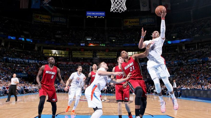 OKLAHOMA CITY, EE.UU. (AP) -- Con su décimo triple-doble de la temporada, Russell Westbrook marcó el compás el domingo en la victoria 93-75 del Thunder de Oklahoma City ante el Heat de Miami.