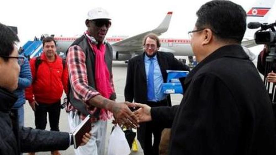 Dennis Rodman llegó a Corea del Norte el lunes con un equipo de exjugadores de la NBA para un juego de exhibición el día del cumpleaños del líder Kim Jong Un. El extravagante miembro del Salón de la Fama llegó a Corea del Norte procedente de Beijing con una escuadra de una docena de ex estrellas, entre ellos Vin Baker y Cliff Robinson, en lo que Rodman llama "diplomacia del baloncesto", aunque autoridades federales estadounidenses han criticado sus esfuerzos. "Esto se trata de tratar de conectar dos países, de que la gente sepa que no todos los países del mundo son tan malos, especialmente Corea del Norte", dijo Rodman a The Associated Press en una entrevista en Beijing antes de tomar el avión con destino a Pyongyang. "La gente dice muchas cosas negativas sobre Corea del Norte. Quiero que la gente del mundo vea que no es tan malo". Estados Unidos mantiene un diferendo con Corea del Norte sobre su programa de armas nucleares y a Rodman lo han criticado por no hablar del historial de derechos humanos del país, considerado como uno de los peores por los activistas, el Departamento de Estado y desertores norcoreanos. Los desertores han testificado repetidas veces sobre los supuestos asesinatos, violaciones, golpizas y penas de prisión a 120.000 personas consideradas opositores del autoritario líder Kim Jong Un, el tercero de su familia que gobierna el país. Los jugadores estadounidenses deben competir en un juego de exhibición contra el equipo nacional de Corea del Norte el miércoles, cumpleaños de Kim. "De alguna manera nos estamos llevando bien, sin importar los desacuerdos que tengamos en la vida", dijo Rodman. "Es como decir: ¿Por qué tenemos los Juegos Olímpicos? Cuando todos se reúnen en los Juegos Olímpicos no hay problema. Eso es lo que estoy haciendo. Eso es todo lo que estoy haciendo".