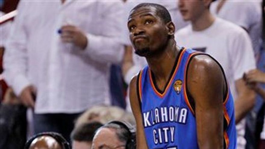 Hace una semana, tenía una ventaja en la final de la NBA. Ahora, el Thunder de Oklahoma City se dirige a casa para rumiar las lecciones propinadas por el Heat de Miami. Luego de ser el favorito para llevarse la serie, el Thunder cayó en el quinto partido de la final el jueves, mientras Miami terminó su carrera rumbo al campeonato al humillar 121-106 Oklahoma City. El triunfo por ventaja de 11 puntos del Thunder en el primer encuentro de la final ha sido olvidado y ahora resulta irrelevante, considerando que por primera vez en más de tres años, el equipo ha perdido cuatro partidos consecutivos. Y sucedió en el peor de los momentos y en el máximo escenario. "Cuando juegas contra los mejores, aprendes", dijo el entrenador del Thunder, Scott Brooks. Kevin Durant anotó 32 puntos y sumó 11 rebotes, y Russell Westbrook terminó con 19 puntos por el Thunder. La cifra de Westbrook resulta engañosa, pues acertó apenas cuatro de 20 disparos, un partido después de una actuación de 20 encestes en 32 tiros. Ambos jugadores fueron sustituidos a 4:44 minutos del final, cuando el resultado de antemano estaba decidido y los aficionados del Heat festejaban, delirantes. James Harden aportó 19 puntos y Derek Fisher 11 por el Thunder. Con una desventaja de 10 puntos al medio tiempo, el Thunder redujo el déficit a la mitad cuando apenas había transcurrido un minuto del tercer cuarto. Fue la última esperanza de la temporada —Miami se apoderó del partido, y del título, mediante una racha de 34-13 que colocó el marcador 93-67 con una jugada de tres puntos de Dwyane Wade con 1:23 minutos por jugar en ese crucial cuarto. Mike Miller encestó su sexto tiro de tres puntos de la noche, y el décimo tercero de Miami, en la primera posesión del último cuarto. Miller volvería a aportar uno más. A partir de ese punto, el reloj sólo marcó lo que quedaba en el partido. Estaba agotando el tiempo restante en la temporada de Oklahoma City. "Perdimos contra un equipo que jugó mejor que nosotros en cuatro de los cinco partidos", consideró Brooks.