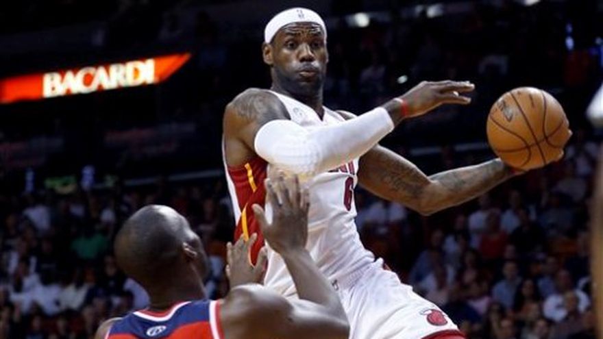 LeBron James anotó 24 puntos y el Heat de Miami superó en rebotes a los Wizards de Washington rumbo a una victoria el domingo por 99-71. El Heat, superado con 38 rebotes los tres partidos anteriores, se impuso en esta ocasión 50-39 en la estadística. Udonis Haslem recuperó 12 para Miami. En un desigual final, el Heat consiguió los últimos 21 puntos del partido y no permitió que Washington le anotara en los últimos 7:07 minutos de juego. James estiró a 32 su racha de partidos en los que ha anotado al menos 20 puntos en la campaña. La racha es de 53 al hilo al incluir la postemporada anterior. Los Wizards, que ocupan el último lugar en puntos y eficacia anotadora en la NBA, acertaron 36% de los lanzamientos. Perdieron su quinto juego consecutivo y su foja es de 0-13 como visitantes contra equipos de la Conferencia Este. Por los Wizards, el brasileño Nene Hilario logró cinco puntos y seis rebotes durante 22:11 minutos en la cancha. Acertó dos de seis lanzamientos y uno de dos tiros libres.