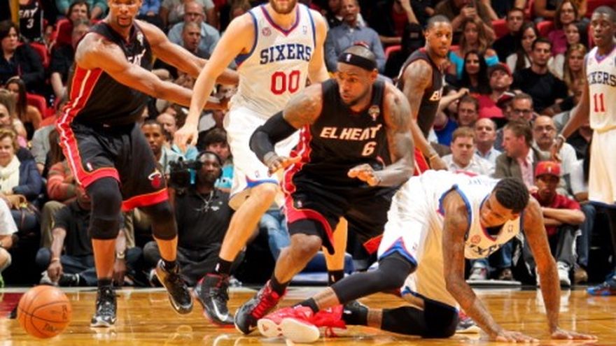 LeBron James anotó 25 puntos y recuperó 10 rebotes, Dwyane Wade sumó 22 tantos y el Heat de Miami volvió a ganar, sacando el partido al final en la victoria del viernes por 102-93 sobre los 76ers de Filadelfia. El Heat suma 17 triunfos consecutivos. Todo ocurrió en una noche en la que James descansó los últimos ocho minutos, un descanso no planeado que inició cuando el juego no estaba decidido. "Mejoramos esta noche", dijo James. "Y eso es lo más importante", agregó. Chris Bosh aportó 16 tantos, Ray Allen otros 12 y Shane Battier 11 para el Heat, que igualó la 12da racha de victorias más larga en la historia de la NBA y se convirtió en el primer equipo de la liga en asegurar un puesto en postemporada. James fue a la banca cuando restaban 8:02 minutos de juego, y con el Heat adelante en el marcador sólo por ocho puntos. Filadelfia nunca se acercó más a partir de entonces, y James terminó su 11ava actuación más corta de la temporada en cuanto a minutos: de poco más de 34. "Buena victoria en equipo, particularmente en la segunda mitad", dijo el entrenador en jefe del Heat Erik Spoelstra. "Nuestra banca estuvo realmente sintonizada". Thaddeus Young sumó 25 tantos, Dorell Wright agregó 14 y Spencer Hawes finalizó con 13 unidades y 10 rebotes para los 76ers, que perdieron su 12da derrota consecutiva como visitantes y la 13ra consecutiva contra Miami en temporada regular. Jrue Holiday agregó 13 asistencias para Filadelfia, la mayor cifra del juego. Los 76ers fueron superados por 48-31 en los últimos 19 minutos. "Estoy muy orgulloso de ellos", dijo el entrenador en jefe de Filadelfia Doug Collins. "Nuestros chicos pelearon esta noche. Realizaron un tremendo trabajo y es simplemente que Miami es un gran, gran equipo y eso es lo que ocurre con grandes equipos. Ellos intensifican la acción y te comprimen durante cerca de cinco o seis minutos y luego toman el juego. Eso es lo que los campeones han hecho siempre, así que no podría pedir nada más a nuestros muchachos. Pienso que realizaron todo lo que podían hacer", añadió. Abajo por nueve en el tercer período, el Heat tomó la ventaja 76-75 cuando James encestó un triple justo con el timbre que finalizó el período, luego asumió el control con una racha de 17-4 durante un lapso de 5 minutos en el cuarto período. "Cada ocasión que uno puede encestar un tiro grande como ese al final del cuarto, es definitivamente un momento de cambio de velocidad", dijo Young. "Y pienso que eso es lo que les dio impulso y salieron y simplemente saltaron sobre nosotros en el cuarto (período)", agregó. En Los Ángeles, Kobe Bryant encestó un tiro de tres puntos con cinco segundos por jugar para empatar el marcador en el tiempo regular, luego realizó una clavada para el enceste de la ventaja definitiva cuando restaban 10 segundos del tiempo extra para ayudar a los Lakers de Los Ángeles a vencer por 118-116 a los Raptors de Toronto, para su segundo triunfo seguido tras estará abajo en el marcador. Dos noches después de superar una desventaja de 25 puntos para ganar como visitantes en Nueva Orleáns, los Lakers se recuperaron de un déficit de 15 unidades en el tiempo regular y de un inicio lento en el tiempo adicional para ganar terreno sobre Utah por el octavo y último boleto de postemporada en la Conferencia Oeste; además subieron un juego del promedio de .500. Bryant terminó con 41 puntos y 12 asistencias, acertando 14 de 16 tiros libres, y Dwight Howard registró 24 unidades y 13 rebotes. DeMar DeRozan encabezó con 28 puntos a seis jugadores de Toronto que tuvieron 10 unidades o más. El titular Andrea Bargnani dejó el juego en el primer cuarto debido a tirantez en el codo derecho. En otros resultados de la jornada: Oklahoma City venció por 116-94 a Charlotte; Indiana por 115-86 a Orlando; Memphis por 103-92 a Cleveland; Brooklyn por 95-78 a Washington; y Dallas por 102-89 a Detroit. Chicago derrotó a Utah por 89-88; Boston a Atlanta en tiempo extra por 107-102; Portland a San Antonio por 136-106; Sacramento a Phoenix por 121-112, y Houston a Golden State por 94-88.