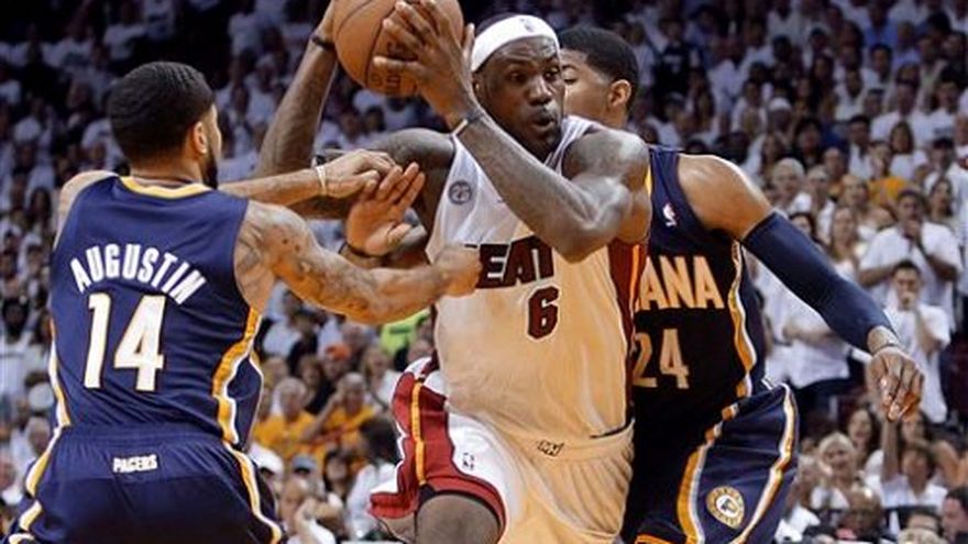 LeBron James anotó 30 puntos, Udonis Haslem encestó sus últimos ocho tiros de campo para sumar 16 puntos, y el Heat de Miami se valió de un tercer cuarto dominante para voltear las acciones y derrotar el jueves por 90-79 a los Pacers de Indiana en el quinto juego de la serie final de la Conferencia Este. Mario Chalmers anotó 12 unidades y Dwyane Wade agregó 10 por el Heat, que encabeza la serie por 3-2 y buscará concretarla en Indiana el sábado por la noche. El Heat superó a los Pacers en seis juegos en una segunda ronda de postemporada de la campaña pasada. Paul George registró 27 puntos y 11 rebotes por los Pacers, quienes tuvieron 22 puntos de Roy Hibbert y 17 de David West.