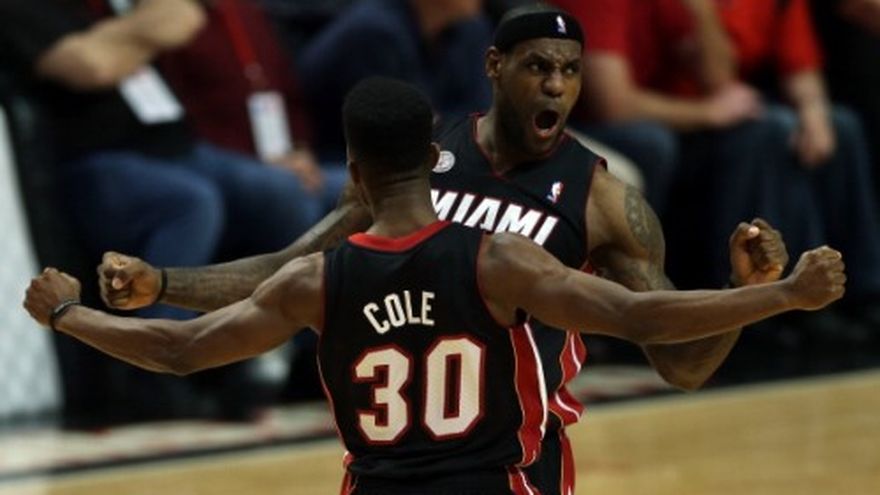 LeBron James hizo gala de su poderío al final y terminó con 25 puntos, Chris Bosh aportó 20 unidades y 19 rebotes y el Heat de Miami sumó al triunfo más apabullante que ha logrado en su historia en los playoffs la victoria por 104-94 que consiguió el viernes sobre los Bulls de Chicago para ponerse en ventaja 2-1 en las semifinales de la Conferencia del Este. Norris Cole anotó 18 puntos y el Heat se alzó con un difícil triunfo después de aplastar el miércoles 115-78 a los Bulls. En esta ocasión, los Bulls se rehusaron a ser mansos al margen de que venían de la peor derrota en playoffs en la historia del equipo. Hay que dejar de lado que no jugaron Luol Deng (por malestar) ni Kirk Hinrich (por lesión en la pantorrilla), sin mencionar a Derrick Rose ni que Nazr Mohammed fue expulsado en el segundo periodo por tirar a James de un empellón. El Heat, por su parte, simplemente tuvo demasiado combustible para el final. James acertó sólo seis de 17 lanzamientos e incluso Nate Robinson le bloqueó un intento de clavada en el tercer cuarto. Sin embargo, el cuatro veces jugador más valioso de la liga se hizo presente al final al anotar 12 puntos en el último cuarto. James y Cole consiguieron dos cruciales tiros de tres puntos. Bosh estuvo encendido después de dos partidos en los que no estuvo muy animado, en tanto que la banca de Miami superó 36-8 a la de Chicago. Carlos Boozer fue el máximo anotador de Chicago con 21 puntos. Robinson y Jimmy Butler lograron cada uno 17 unidades. Joakim Noah contribuyó con 15 puntos y 11 rebotes, en tanto que Marco Belinelli logró 16 unidades, pero los Bulls no pudieron remontar. Se acercaron a 85-83 con enceste de Cole con la punta de los dedos a cuatro minutos del final y Miami comenzó a tomar el control a partir de ese momento. James respondió a una canasta de tres puntos de Belinelli con otra igual y después Boozer acertó un disparo para Chicago; Cole aportó otro triple para el Heat y puso el marcador 96-88 a 1:48 de la conclusión del encuentro.