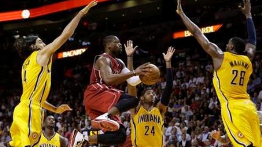 Durante buena parte de la noche, casi todo le salió mal al Heat de Miami. Hubo numerosas fallas en los triples, reclamos a los árbitros e incluso discusiones entre los compañeros. Pero una estupenda racha frente al aro cambió todo. Dwyane Wade anotó 32 puntos, Ray Allen acertó un triple que significó la ventaja con menos de un minuto por jugarse y el Heat borró una desventaja de 15 unidades en la segunda mitad para superar el miércoles 97-94 a los Pacers de Indiana. LeBron James aportó 24 puntos a la causa del Heat, pese a seguir resintiendo una torcedura del tobillo izquierdo. Con la victoria, Miami se acercó a un juego de los Pacers, líderes de la Conferencia del Este. "Esto muestra que somos un equipo que tiene experiencia", dijo Wade. "Sin importar cuál sea el marcador, siempre sentimos que hay una oportunidad de ganar el partido". Así que, incluso cuando Indiana tenía una ventaja de 68-53 a la mitad del tercer periodo, Miami conservó la esperanza. E incluso cuando James y Mario Chalmers se enfrascaron en una acalorada discusión durante uno de los momentos más difíciles del partido, el Heat no se hundió en la desesperación. "Fue un buen triunfo", dijo James, quien se responsabilizó por el altercado con Chalmers, quien a su vez consideró olvidado el asunto. "Fue un triunfo de muy buena calidad frente a un equipo estupendo en nuestra cancha. Tuvimos que sobreponernos a todo". Chris Bosh añadió 15 puntos por Miami, incluido un triple que empató el marcador en el cuarto periodo. James sirvió para que Allen anotara el triple que dio la ventaja en definitiva a Miami, con 59,5 segundos restantes. Así, el Heat coronó una racha de 10 puntos sin respuesta. Paul George anotó 25 puntos pero falló un triple que pudo haber empatado el encuentro con cuatro segundos por disputar. David West anotó 23 unidades y Lance Stephenson agregó 13 por los Pacers, que han sufrido dos derrotas consecutivas. También por los Pacers, el argentino Luis Scola jugó 14 minutos, en los que sumó ocho puntos, dos rebotes y un par de faltas. Al igual que Miami, San Antonio aprovechó una ofensiva espectacular, pero en el tercer periodo y protagonizada por Manu Ginóbili. El argentino anotó 24 puntos, incluidos 11 en los últimos cuatro minutos y fracción, y los Spurs se despegaron en el marcador para derrotar 108-101 a los Suns de Phoenix, que vieron cortada una racha de cinco triunfos consecutivos. Ginóbili sumó también seis rebotes y siete asistencias en 27 minutos. "Jugué muy bien", consideró. "Perdí muchos balones pero en general disparé bien en algunos minutos y moví la pelota. Creo que lo hice bien. Estoy contento por ayudar a que el equipo ganara, porque estábamos en una mala racha. Perdimos el último partido" Tim Duncan agregó 17 unidades y 13 rebotes, mientras que Kawhi Leonard anotó 14 por los Spurs, que carecieron de su armador francés Tony Parker, por lesión. El brasileño Tiago Splitter tuvo una participación de 12 minutos, con ocho puntos y cuatro rebotes, también por San Antonio. Channing Frye anotó 15 de sus 22 puntos en el primer cuarto por los Suns. Goaran Dragic totalizó 18 unidades y Eric Bledsoe aportó 15, pero los dos escoltas acertaron apenas 12 de 33 disparos de campo en forma combinada. Miles Plumlee totalizó 13 puntos y el mismo número de rebotes, por Phoenix. Encabezados por Ginóbili, los Spurs superaron a los Suns por 15-6 en los últimos 4:11 minutos, luego que Phoenix tomó una ventaja de 95-93. "Él es una pesadilla", opinó Channing Frye, de Phoenix. "Es absolutamente asombroso. Hace un gran trabajo y nunca se rinde. Pensé que se cansaría al final, pero evidentemente me equivoqué". En otro partido, los Hawks de Atlanta derrotaron 124-107 a los Kings de Sacramento, con 25 puntos y 10 rebotes del dominicano Al Horford, y los Knicks de Nueva York doblegaron 107-101 a los Bucks de Milwaukee en dos tiempos extra. Además, el Jazz de Utah se impuso 86-82 al Magic de Orlando; los Bobcats de Charlotte superaron 104-102 a los Raptors de Toronto en tiempo extra; los Pistons de Detroit vencieron 107-106 a los Celtics de Boston; los Wizards de Washington derrotaron 113-107 a los Nets de Brooklyn; los Timberwolves de Minnesota doblegaron 120-109 a los Trail Blazers de Portland; los Mavericks de Dallas aplastaron 105-91 a los Grizzlies de Memphis; los Rockets de Houston apalearon 109-94 a los Bulls de Chicago y los Clippers de Los Ángeles triunfaron 108-95 sobre los Pelicans de Nueva Orleáns.