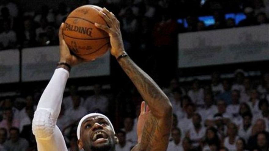 Más vale que LeBron James se recupere a tiempo. Ha esperado mucho para levantar un trofeo de campeón y el jueves tendrá la oportunidad de conseguirlo. James, que tenía dificultades para moverse, se sobrepuso a una lesión de la pierna izquierda para encestar el triple que rompió el empate a 2:54 minutos del final, y el Heat de Miami derrotó el martes 104-98 al Thunder de Oklahoma City para colocarse 3-1 en la final de la NBA. Ante la mirada de James desde el banquillo en los últimos segundos del duelo, Mario Chalmers coronó una estupenda actuación de 25 puntos para igualar el aporte de Dwyane Wade. James totalizó 26 puntos, 12 asistencias y nueve rebotes. Sólo se perdió el "triple doble" por estar en el banquillo al final, luego de lastimarse la pierna al caer en la cancha. El quinto partido es el jueves por la noche, y James tendrá una oportunidad de ver premiada su larga búsqueda de un campeonato que ha añorado desde que militaba en Cleveland, el equipo que abandonó para marcharse al sur de la Florida. Ningún equipo ha dejado escapar una ventaja de 3-1 en la historia de la final. "Puedo garantizarles esto: seguiremos peleando", prometió el entrenador del Thunder, Scott Brooks. Russell Westbrook logró su mejor cifra de la postemporada, con 43 puntos, por el Thunder, que desperdició una ventaja de 17 puntos pero siguió peleando hasta el final gracias a su sensacional armador. Kevin Durant añadió 28 puntos, pero James Harden volvió a decepcionar, al sumar apenas ocho unidades y acertar sólo dos de sus 10 disparos. Westbrook y Durant fueron los únicos jugadores del Thunder que anotaron en los últimos 16:46 minutos. James se tambaleó y cayó en la cancha al conducir el balón, a la mitad del cuarto periodo. Permaneció frente a la cesta contraria mientras el Heat recuperaba el balón, y encestó para poner el marcador en 92-90. Luego que Westbrook falló un disparo, el Heat pidió una pausa mientras James recibía ayuda para abandonar la cancha. Incapaz de caminar, debió ser cargado por un par de compañeros. Regresó ovacionado cuando restaban poco más de cuatro minutos. Después de que Chris Bosh empató el encuentro, James caminó lentamente antes de intentar un triple, quizás sabiendo que no podía driblar a nadie. Ello puso el marcador 97-94, y cuando Wade agregó un enceste a 2:19 minutos del timbrazo, el Heat tenía finalmente un margen para resistir la gran actuación de Westbrook, que no dejó de anotar. "Sin importar lo que pase, sin excusas, uno no quiere abandonar la cancha sabiendo que pierde oportunidades", dijo Wade.
