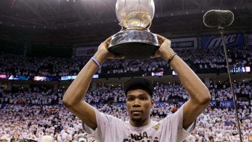 Gane o pierda, después de casi todos los partidos del Thunder de Oklahoma City, puede escucharse a Kevin Durant hablar sobre la necesidad de seguir trabajando y mejorar. Ese fue su enfoque cuando el Thunder llegó a un tener una foja de 3-29 y era el hazmerreír de la liga. Y es el mismo ahora que guió al equipo a la final de la NBA tres años después. Durant nunca ha caído en la ostentación y el glamour. Su combinación ganadora ha sido la humildad y el esfuerzo, y pronto podría rendir frutos. El Thunder necesita cuatro victorias más para ganar un campeonato en apenas su cuarta temporada en Oklahoma City y cumplir la máxima meta de Durant. "Siempre existe otro nivel al cual ascender. En el básquetbol, uno siempre puede mejorar en algo, creo yo", dijo Durant el sábado tras el entrenamiento de Oklahoma City. "No he visto a alguien que domine por completo este juego en todos los aspectos. No puede encestar todos los tiros, no puede quedarse con todos los rebotes, no puede aportar todas las asistencias, por lo que creo que uno puede mejorar. Esa es la mentalidad que asumo". Durant ha logrado lucir en cada una de esas categorías, sobre todo esta temporada. El alero se convirtió en el séptimo jugador en la historia de la liga en ganar tres títulos consecutivos por puntos anotados en una temporada, promediando 28 puntos por partido, e impuso marcas personales en porcentaje de disparos acertados, tiros de tres puntos anotados, rebotes, asistencias y tiros bloqueados. Y aún así siente el impulso de desear más. "No diría que me siento satisfecho", dijo Durant. "Estoy contento de haber mejorado un poco. Me falta mucho camino por recorrer y pienso que de seguir trabajando en el aspecto mental del juego —viendo videos y empapándome de cómo va a jugar la defensiva, sabiendo dónde van a estar mis compañeros— entonces puedo mejorar". Mientras Durant se acercaba a su primera oportunidad de irse de Oklahoma City —pese a que sería como agente libre con restricciones— las preocupaciones se acentuaron sobre si una superestrella en ciernes desearía permanecer en uno de los mercados más pequeños de la liga sin tantas posibilidades de ganar dinero y promoverse más allá del básquetbol. En vez de eso, dejó pasar la oportunidad de incluir una cláusula de rescisión en su contrato absoluto para quedarse cinco años más en Oklahoma City. "Mi trabajo es esforzarme en ser un mejor jugadar cada día y seguir me ofrece la oportunidad ideal", dijo Durant. "Esta ciudad es tan tranquila, y así soy yo como persona. Es el lugar perfecto para vivir, el perfecto para traer a tu familia, un lugar placentero para relajarse y disfrutar la vida".