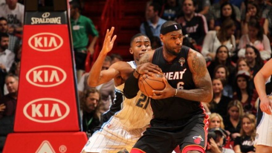 El juego en el filo, LeBron James sabía que tenía que llegar hasta el aro, y lo consiguió. James anotó 26 puntos, incluyendo el tiro definitivo a 3,2 segundos del final, y el Heat de Miami rescató un triunfo de 97-96 sobre el Magic de Orlando el miércoles pese a un mal cierre de partido, para extender su racha ganadora a 16 juegos, la más larga en la historia del equipo. "No tenía intenciones de realizar otro tiro", comentó James. Él había fallado un par de tiros de tres puntos aproximadamente 90 segundos antes, así que se decidió a atacar la canasta. Desde la banda derecha, James ingresó hacia la línea en forma diagonal y encestó con la mano izquierda —al fin y al cabo es zurdo— el enceste que dio el triunfo a Miami. Fue la primera ocasión en que anotó la canasta que significaría la victoria en los últimos cinco segundos de un juego desde que anotó un tiro de tres puntos para derrotar al Magic en la postemporada de 2009, según la agencia de estadísticas STATS LLC. "Esto es duro", dijo el entrenador en jefe del Magic Jacque Vaughn después de que su equipo cayó a marca de 0-2 ante Miami esta temporada, siendo las dos derrotas por un total de tres unidades. "Tuvimos chicos que batallaron, que realmente querían ganar este juego y merecían ganar este juego". Dwyane Wade aportó 24 puntos y Chris Bosh agregó 17 tantos y 10 rebotes por el Heat, que dejó ir una ventaja de 20 puntos en la segunda mitad para luego remontar de una desventaja de cinco tantos en los minutos finales. Nikola Vucevic registró 25 puntos y 21 rebotes por el Magic, que recibió el apoyo de Jameer Nelson y Tobias Harris con 16 tantos cada uno, 13 de Arron Afflalo y 12 de Maurice Harkless. "Ellos son uno de los mejores equipos en la NBA, si no es que el mejor, y nosotros lo dimos todo", dijo Harris. "Ellos lo sabían. Fue cuestión de un par de segundos que pudieron haber cambiado el juego. Es una dura derrota para nosotros, pero fue el paso correcto en la dirección correcta", agregó. Vucevic tiene ahora dos juegos de 20 rebotes o más en su carrera, ambos esta temporada y ambos contra Miami. Registró 20 puntos y 29 rebotes en la derrota ante el Heat del 31 de diciembre. Pero fue uno de los tres jugadores del Magic que tuvieron que dejar el juego en los últimos minutos por acumulación de faltas, dejando Orlando escapar una oportunidad de oro. La diferencia en la cifra de faltas —30 del Magic por 17 de Miami— fue un tema candente en el vestuario de Orlando después del juego. El Magic anotó 10 de 12 tiros libres, mientras que Miami encestó 27 de 31. En San Antonio, Tim Duncan sumó 18 puntos y 10 rebotes, el argentino Emanuel Ginóbili aportó 18 unidades y nueve asistencias, y los Spurs de San Antonio vencieron 101-83 a los Bulls de Chicago. Ginóbili también sumó tres rebotes en sus 26:15 minutos en la cancha, mientras que el brasileño Tiago Splitter aportó 13 puntos y 10 rebotes en 32:01 minutos para San Antonio (48-14). Kawhi Leonard añadió 14 puntos. Marco Belinelli metió 21 puntos, Luol Deng sumó 19, Marquis Teague aportó 11 y Carlos Boozer encestó 10 para Chicago (34-27). En otros resultados de la jornada: Cleveland venció por 104-101 a Utah; Brooklyn por 99-78 a Charlotte; Boston por 83-81 a Indiana; Atlanta ganó a Filadelfia por 107-96, Nueva York a Detroit por 87-77; Memphis a Portland por 91-85. Minnesota derrotó por 87-82 a Washington; Los Lakers de Los Ángeles por 108-102 a Nueva Orleáns; Dallas por 112-108 a Houston 108; Toronto por 98-71 a Phoenix; Golden State por 87-83 a Sacramento, y los Clippers de Los Ángeles superaron por 117-101 a Milwaukee.