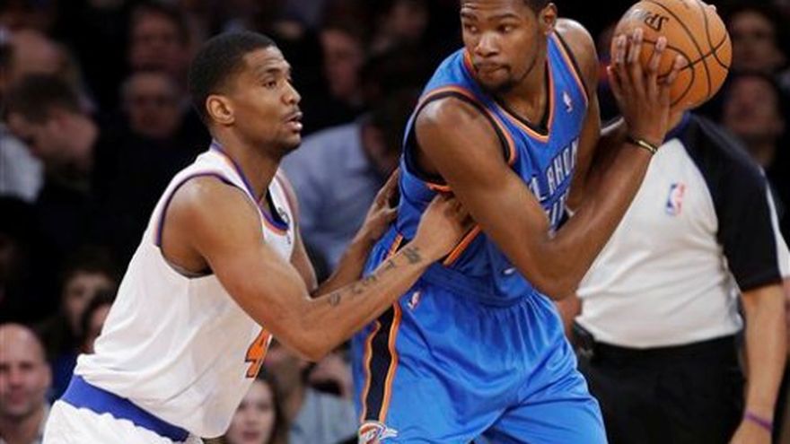 El duelo Kevin Durant-Carmelo Anthony fue pospuesto, aunque J.R. Smith llenó muy bien la ausencia, durante tres cuartos. El Thunder de Oklahoma City finalmente silenció los disparos entreverados de los Knicks en el cuarto período, aguantando al final para derrotar el jueves por la mínima diferencia de 95-94 a Nueva York, cuando Smith falló un disparo cuando sonaba el fin del juego. "Hemos sido víctimas de esos disparos (finales) para ganar el juego en un par de ocasiones este año y no queríamos que ocurriera nuevamente", dijo Durant. "Así que sólo teníamos que cerrar las puertas y detenerlos", agregó. Durant anotó 34 puntos, entre ellos los dos tiros libres de la ventaja con 1:38 minutos por jugar, y el Thunder de Oklahoma City sacó una apretada victoria de 95-94 sobre los Knicks de Nueva York el jueves. Russell Westbrook batalló en los últimos tres cuartos del partido, pero terminó con 21 puntos, seis rebotes y cinco asistencias en la primera visita del Thunder a Nueva York desde el 22 de diciembre de 2010. Durant aportó también ocho rebotes y seis asistencias. Kevin Martin anotó 16 puntos y Oklahoma City registró su tercera victoria consecutiva ante un enérgico esfuerzo de un equipo de Knicks que sufre la ausencia de su estrella Carmelo Anthony por rigidez y molestia en la rodilla derecha, según dijo el club. "Fue una gran lucha. Quiero decir que dimos un combate extraordinario allí esta noche", comentó el alero de los Knicks Amare Stoudemire. "Jugamos en grande a la defensiva, a la ofensiva estuvimos jugando bien, el balón se estuvo moviendo, así que podemos estar contentos con la forma en que jugamos, aunque un poco contrariados porque perdimos al final", añadió. J.R. Smith registró su mayor desempeño ofensivo de la campaña con 36 puntos por los Knicks pero erró un disparo crucial que habría dado el triunfo a Nueva York mientras el reloj expiraba. "Mi tiro fue bastante bueno toda la noche, excepto en el cuarto período y simplemente no entró", dijo Smith. Ningún equipo tuvo ventaja de más de dos puntos en los últimos 10 minutos y medio. Durant encestó 12 unidades en el último cuarto, mientras que Westbrook fue acallado. Anthony se lesionó el lunes en Cleveland, cayendo a la cancha sin haber recibido contacto cuando trataba de atrapar un pase. El entrenador en jefe Mike Woodson dijo que está en observación día a día y que no cree que la lesión sea grave. Pero los Knicks dijeron lo mismo respecto a Jeremy Lin la temporada pasada y sobre otros en años recientes, así que sus aficionados no se tranquilizarán hasta que vean a Anthony de regreso en la cancha. La lesión de Anthony evitó un enfrentamiento entre los dos máximos anotadores de la NBA: él tiene promedio de 28,2 puntos por juego, frente a 28,6 de Durant.