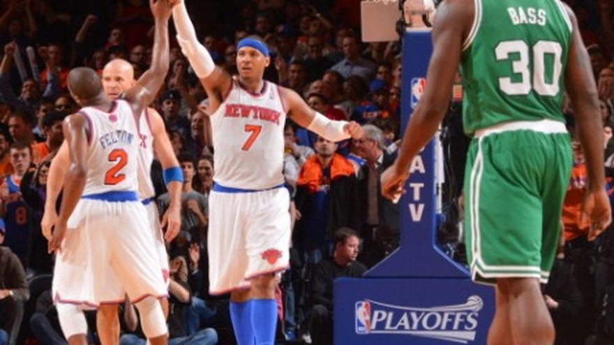 Carmelo Anthony anotó 36 puntos y los Knicks de Nueva York vencieron el sábado por 85-78 a los Celtics de Boston en el primer partido de playoff. Luego de derribar a los Celtics de la cima de la División del Atlántico, los Knicks también dieron el primer paso para eliminarlos en la primera ronda de playoffs al contener a Boston a tres canastas y ocho puntos en el período final. Anthony, el líder anotador de la NBA, encestó apenas 13 de 29 intentos de campo, pero sumó ocho puntos en el cuarto período, incluyendo canastas consecutivas al final del período que le dio a los Knicks espacio para respirar en un partido apretado. El segundo partido de la serie será el martes, antes de que los Celtics sean anfitriones en el tercer enfrentamiento el viernes en lo que será su primer partido en casa desde los atentados en Boston. Jeff Green anotó 26 puntos y Paul Pierce sumó otros 21 para los Celtics, que extrañaron demasiado al base armador lesionado Rajon Rondo al cometer 21 pérdidas de balón que generó 20 tantos en contra. Los Knicks hicieron lo que quisieron en el cuarto período, cuando Boston encestó apenas tres canastas de 11 intentos. Kevin Garnett sumó ocho puntos y nueve rebotes pero embocó apenas cuatro de 12 intentos de campo. Jason Terry, otro veterano en un joven equipo de los Celtics, falló sus cinco disparos saliendo de la banca. Los Celtics tenían la ventaja luego de tres períodos y empataron el encuentro por última ocasión a 72 con un disparo de Garnett con 8:13 minutos por jugarse. Después, Anthony embocó canastas consecutivas y antes de que los Celtics se acercaran a tres ya avanzado el cuarto período, encestó otros dos disparos, el segundo un largo doble, que le dio a Nueva York una ventaja de 83-76 con 1:21 en el reloj de la que Boston no se repuso. J.R. Smith anotó 15 tantos y Raymond Felton otros 13 para los Knicks, mientras que Martin finalizó con 10 puntos y rebotes una gran participación para Nueva York con Tyson Chandler batallando por 20 minutos sin anotación luego de jugar muy poco al final de la campaña por una protrusión discal. Los Knicks terminaron con el reinado de cinco años en que los Celtics dominaron la División del Atlántico al terminar la campaña con foja de 54-28 y ganar su primer título divisional desde 1994 con el mayor número de triunfos desde la campaña 1996-97 que terminaron 57-25. El paso siguiente será tener éxito en los playoffs para Nueva York, que no ha ganado una serie de postemporada desde el 2000 y ni siquiera pudieron sacarle un partido a los Celtics hace dos años. Los Celtics utilizaron un parche reconociendo la difícil semana en Boston luego de los atentados que dejaron tres personas muertas el lunes en el Maratón de la ciudad. "Boston se levantará y correrá de nuevo", dijo Pierce. Los aficionados apoyaron a la ciudad de Boston pero no a los Celtics, tal como esperaba el entrenador Doc Rivers esperaba. Garnett fue abucheado, luego del enfrentamiento que tuvo con Anthony en la campaña regular que resultó en partido de suspensión para Anthony luego que intentó confrontar a Garnett afuera del autobús de los Celtics. Los Knicks jugaron sin el argentino titular Pablo Prigioni debido a un problema en el tobillo, y el novato Copeland se fue sin anotación en su lugar. Los Knicks tuvieron foja de 16-2 con Prigioni en la alineación titular durante la campaña.