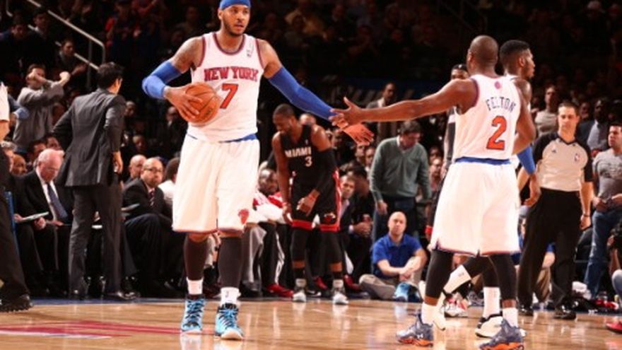 Carmelo Anthony anotó 24 puntos, el italiano Andrea Bargnani añadió 19 y los Knicks de Nueva York derrotaron el jueves 102-92 al Heat de Miami para apuntarse su tercer triunfo consecutivo, la mejor racha que han tenido en la campaña. Raymond Felton sumó 13 puntos y 14 asistencias por los Knicks, que tomaron el control del duelo mediante una ofensiva de 16 puntos contra dos, entre el tercero y el cuarto periodo. Nueva York superó al Heat por cuarta vez en cinco enfrentamientos, a lo largo de las últimas dos temporadas. "Uno puede notar que las cosas son diferentes de hace un mes", dijo Bargnani. "Nuestros rostros son diferentes, nuestro lenguaje corporal también es diferente". La campaña anterior, los Knicks eran segundos de la Conferencia del Este, detrás de Miami. Ganaron por 3-1 su serie de encuentros en el año. Pero ahora, no había motivo para pensar que los Knicks tuvieran posibilidades de victoria ante los campeones reinantes de la NBA. Nueva York tiene una foja de 13-22, aunque ha ganado cuatro de sus cinco compromisos en 2014, con triunfos sobre San Antonio y Miami -los finalista de la temporada pasada. "No iba a durar así toda la campaña", dijo Felton. "Sólo pasábamos por un bache, ahora siento que hemos salido de él". Ante la ausencia de Tyson Chandler por enfermedad y en un día en que J.R. Smith quedó relegado al banquillo por un aparente castigo, Amare Stoudemire contribuyó con 14 puntos y 11 rebotes como reservista. LeBron James totalizó 32 puntos por el Heat, que jugó sin sus titulares lesionados Mario Chalmers y Shane Battier. Miami no recibió mucha ayuda de Chris Bosh, limitado a seis puntos, fruto de tres encestes en 10 disparos. "Lo único que sé sobre este partido es que nos superaron y ellos se ganaron la victoria", dijo el técnico del Heat Erik Spoelstra. Dwyane Wade anotó 23 tantos pero falló todos sus seis tiros libres tras perderse la práctica matutina y mientras Miami veía el fin de una racha ganadora que les duró tres juegos. "Sólo fallé seis", se justificó Wade. "No fallé 20. No fue tan malo".