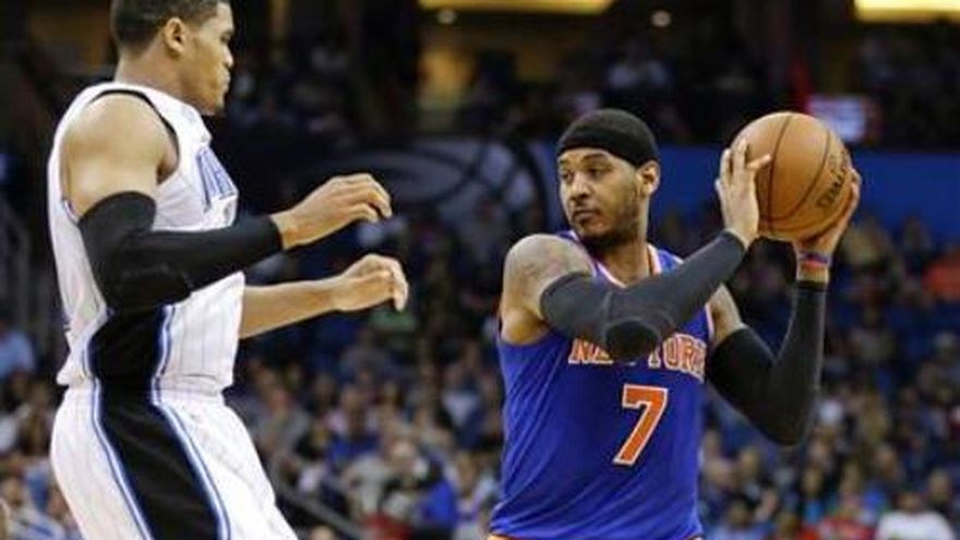 Carmelo Anthony aportó 19 puntos antes de abandonar el partido por un esguince del tobillo izquierdo en el tercer periodo, pero los Knicks de Nueva York soportaron un dinámico intento de remontada para preservar el lunes una victoria por 103-98 sobre el Magic de Orlando. Nueva York llegó a tener una ventaja de 25 puntos antes de verla reducida a un solo enceste en el último cuarto. Beno Udrih convirtió seis tiros libres consecutivos en los últimos 26 segundos para ayudar a que Nueva York sobreviviera. J.R. Smith añadió 18 puntos y 10 rebotes. Los Knicks fueron impulsados también por el regreso de Raymond Felton, quien se había perdido seis compromisos por un tirón en el muslo izquierdo. Nueva York se apuntó su octava victoria seguida sobre el Magic. Arron Afflalo encabezó a Orlando con 26 puntos, mientras que Glen Davis agregó 20 y Jameer Nelson anotó 17. El Magic ha perdido tres encuentros seguidos y 11 de sus últimos 13.