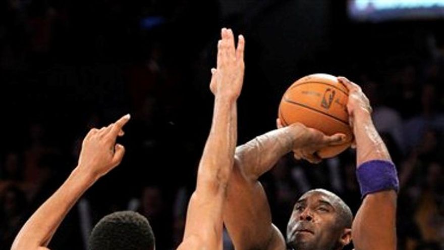 Kobe Bryant anotó seis de sus 26 puntos en el segundo tiempo extra y los Lakers de Los Ángeles superaron una desventaja de 18 unidades en la segunda mitad para vencer el domingo por 114-106 al Thunder de Oklahoma City. Metta World Peace anotó 12 puntos antes de ser expulsado hacia el final del segundo cuarto por un codazo a la nuca de James Harden mientras celebraba una clavada. Harden, quien encestó 14 puntos, regresó brevemente a la banca de Oklahoma City, pero ya no jugó. El español Pau Gasol tuvo 20 unidades, 14 rebotes y nueve asistencias por los Lakers, quienes registraron una recuperación impresionante en su último juego de temporada regular en casa ante los astros del Thunder Kevin Durant y Russell Westbrook, quienes fallaron entre ambos 42 de sus 56 tiros de campo. Los Lakers lo consiguieron con una alineación poco ortodoxa que contó con los jugadores poco utilizados Devin Ebanks y Jordan Hill junto a Bryant, Gasol y el armador reserva Steve Blake, quien acertó tres disparos cruciales desde la distancia de tres puntos. Ebanks anotó ocho puntos y tuvo dos jugadas defensivas muy importantes en el último minuto, mientras que Hill registró 14 puntos y una cifra máxima en su carrera de 15 rebotes. Durant tuvo 35 unidades tras acertar 11 de 34 tiros de campo y ganar ocho rebotes por el Thunder, que ganaba por 11 puntos cuando restaban cuatro minutos del tiempo regular. Westbrook encestó 14 puntos acertando tres de 22 tiros de campo y agregó 10 asistencias con lo cual Oklahoma City cayó un juego atrás de los Spurs de San Antonio, líderes de la Conferencia Oeste, con su tercer derrota en los últimos nueve juegos.