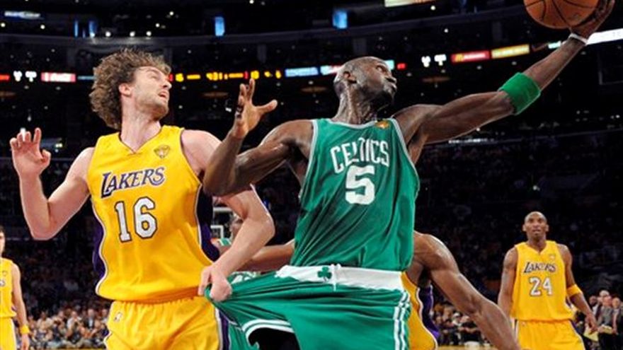 Kobe Bryant anotó 30 puntos, Pau Gasol aportó 23 puntos y 14 rebotes y los Lakers de Los Angeles vencieron esforzadamente el jueves a los Celtics de Boston por 102-89 en el primer partido por el trofeo de la NBA. Ron Artest convirtió 15 puntos luego de caer en la cancha al enredarse con Paul Pierce en el primer minuto de la 12da final entre los rivales más acérrimos en la liga. Bryant encabezó un duro esfuerzo contra los Celtics, que son recordados por haberse sacudido a los Lakers al ganar el encuentro de ambos en la final del 2008 en seis partidos. Pierce consiguió 24 puntos para los Celtics, quienes podrían desear nunca haber sabido que los equipos dirigidos en Los Angeles y Chicago por el entrenador de los Lakers, Phil Jackson, han ganado 47 series consecutivas de playoffs luego de vencer en el primer partido. El segundo encuentro es el domingo.