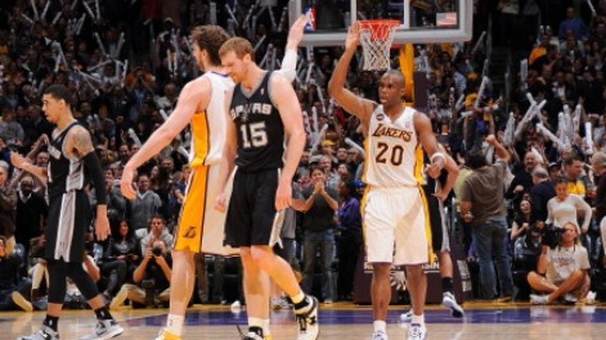 Frente al casillero de Kobe Bryant había una silla vacía el domingo por la noche y los Lakers de Los Ángeles sabían que tendrían que llenarla con trabajo en conjunto. Con sus esperanzas de llegar a los playoffs probablemente en el mismo camino del poderoso San Antonio, los Lakers armaron un esfuerzo de grupo que los mantuvo en la pelea. Dwight Howard tuvo 26 puntos y 17 rebotes, y los Lakers de Los Angeles protagonizaron una dramática racha en el último cuarto para ganar su primer partido desde que perdieron a Kobe Bryant por el resto de la temporada, al superar a los Spurs de San Antonio 91-86 y mantenerse en posición para un lugar en los playoffs. Steve Blake anotó 23 puntos para los Lakers (44-37), que aventajan a Utah (42-38) por 1 ½ juegos por el octavo lugar de la postemporada en la Conferencia Oeste después de su séptima victoria en ocho partidos. Bryant debió ver el partido desde casa. Los Lakers no estaban exactamente contentos por la perspectiva de un futuro sin su líder anotador, pero reaccionaron alentados por haber superado el desafío. "Definitivamente nos da la confianza de que si jugamos tan duro como lo hicimos esta noche, podemos vencer a cualquiera", dijo el español Pau Gasol, que tuvo siete puntos y 16 rebotes. Bryant, que salió cojeando de la cancha del Staples Center con una rotura del tendón de Aquiles el viernes por la noche. Estará inmóvil durante la mayor parte del tiempo en las próximas semanas, pero él tuiteó un plan para hacer una llamada telefónica durante el medio tiempo sobre ajustes para sus compañeros de equipo. La mayoría de los Lakers dijeron que en realidad no supieron nada de Kobe, pero ellos sabían que él estaba orgulloso de ellos. "¡Guau! Bien hecho mis colegas. Bien hecho. UNO MAS (hash) playoffs", escribió Bryant después del partido. Las palabras "UNO MAS" estaban escritas originalmente en español. Los Lakers lucieron torpes a veces, con Gasol fallando 12 de sus primeros 13 tiros y Howard luchando en la línea de tiros libres cuando San Antonio intencionalmente le cometió una falta en el tercer cuarto. Sin embargo, ellos fueron notablemente eficaces, mostrando una suavidad al final del partido que no se ha visto a menudo esta temporada. Tim Duncan tuvo 23 puntos y 10 rebotes para los Spurs, que han perdido seis partidos consecutivos como visitantes. Es probable que San Antonio (58-22) termine segundo en el Oeste detrás de Oklahoma City (59-21), que posee el poder del desempate. Todos los jugadores de los Lakers compartían con Bryant las jugadas y tareas defensivas, trabajando juntos de manera algo imperfecta, pero con eficacia. Blake ocupó el espacio del lesionado Steve Nash y proporcionó un inesperado golpe de puntos junto con el reserva Antawn Jamison, quien anotó nueve de sus 15 puntos en el último cuarto. Los Ángeles reventó un partido empatado con una racha de 15-4 a mediados del último cuarto. El reemplazo inicial de Bryant, Jodie Meeks, conectó dos triples 3 durante esa racha, y Blake agregó tres tiros libres en los segundos finales. En Miami, LeBron James anotó 24 puntos, Dwyane Wade sumó otros 22 y el Heat de Miami fijó un récord del equipo en cuanto a triunfos como local en una temporada al superar el domingo por 105-93 a los Bulls de Chicago. Mario Chalmers y Chris Andersen encestaron 15 puntos cada uno para Miami, que ostenta foja de 36-4 como local. El Heat eclipsó la marca de 35-6 conseguida en 2004-05. Miami mantuvo a Chicago sin una canasta de dos puntos durante los primeros 16 minutos de la segunda mitad, y los Bulls tuvieron que depender casi exclusivamente de tiros de tres puntos. Carlos Boozer finalizó con 16 tantos y 20 rebotes para los Bulls, que el mes pasado rompieron la racha de 27 triunfos consecutivos de Miami. Chicago terminó con 29 encestes de campo y 30 faltas, lo que le permitió al Heat embocar 41 tiros libres, su mayor número en la campaña. La derrota mantiene a Chicago en el sexto puesto en la Conferencia del Este. Miami ya tiene asegurada la ventaja de local para toda la postemporada. En otros resultados de la jornada: Nueva York 90, Indiana 80; Filadelfia 91, Cleveland 77; Toronto 93, Brooklyn 87; Denver 118, Portland 109; Dallas 107, Nueva Orleáns 89; y Houston 121, Sacramento 100.