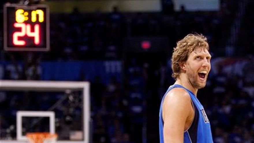 Aun cuando tiene un mal partido, el alemán Dirk Nowitzki cumple su tarea como el baluarte para los Mavericks de Dallas. Nowitzki anotó el sábado 18 puntos en una mala noche, pero acertó algunos tiros cruciales en el último cuarto y llevó a los Mavericks de Dallas a llevarse una victoria de 93-87 sobre el Thunder de Oklahoma City y tomar ventaja de 2-1 en la serie final de la Conferencia del Oeste. El espigado alemán falló 10 de sus primeros 14 tiros a la canasta pero aún así Dallas recurrió a él para resistir el último embate de Oklahoma City, que buscaba convertirse en el segundo equipo que logra remontar una desventaja de 23 puntos para vencer a los Mavericks en esta postemporada. "Es nuestro hombre. En los cuartos períodos va a manejar el balón tan frecuentemente como se lo logremos dar", dijo el entrenador de los Mavericks, Rick Carlisle. "Si falla algunos tiros, no se va a limitar, no se va a desanimar. El tiene el tipo de voluntad que le permitirá seguir intentándolo", agregó. A los Mavericks no les importó que Nowitzki fallara la mayor parte de sus disparos. El equipo aun así le entregó el balón en 10 de 11 ofensivas en cierto momento del partido y el alemán anotó en tres ocasiones, lo suficiente para mantener controlado al Thunder. Nowitzki encestó 18 puntos, al acertar siete de 21 disparos. "No logramos mucho en lo ofensivo durante el segundo tiempo y por ello tuve que seguir atacando para este equipo como lo he hecho en los últimos 13 años. Este equipo necesita que anote y que mantenga la ofensiva en marcha", dijo Nowitzki. Kevin Durant, el máximo anotador de la NBA en la temporada regular, también tuvo problemas ofensivos y sólo encestó siete de 22 intentos para terminar con 24 puntos y 12 rebotes. Russell Westbrook respondió a una estancia en la banca en el cuarto período con 30 puntos e impulsó al Thunder a reducir la desventaja y mantener el partido interesante en los últimos minutos. Los Mavericks ya habían desperdiciado una ventaja de 23 puntos en los últimos 13 minutos de su partido de primera ronda en Portland y llegaron a tener ventaja de 22 unidades cuando quedaban 17 minutos por jugar en esta ocasión. Westbrook y Daequan Cook fallaron triples que pudieron haber acercado al Thunder a sólo tres puntos, pero luego Westbrook perdió el balón antes de que Jason Terry encestara para ampliar la ventaja a 86-78 para los Mavericks cuando quedaban 1:42 minutos de juego. Nowitzki agregó un enceste por la esquina izquierda para retomar ventaja de ocho puntos y después de que Durant acertó un par de tiros libres y Dallas conservó la ventaja a partir de entonces. "Batallamos durante el segundo tiempo, nos mantuvimos juntos y logramos sacar el resultado", dijo Nowitzki. Shawn Marion anotó 18 puntos y Kidd y Terry contribuyeron con 13 cada uno. Tyson Chandler capturó 15 rebotes, seis de ellos ofensivos. Los Mavericks, que empataron con Miami al registrar la mejor foja de la liga como visitante en la temporada regular, ganaron por cuarta ocasión consecutiva fuera de Dallas en esta postemporada y recuperaron la ventaja de localía dos noches después de perderla en el segundo juego de la serie. Por los Mavericks, el puertorriqueño Juan José Barea anotó dos tiros de cinco intentos para sumar cuatro puntos en 13:47 minutos de juego, en los que también sumó cuatro asistencias y dos rebotes.