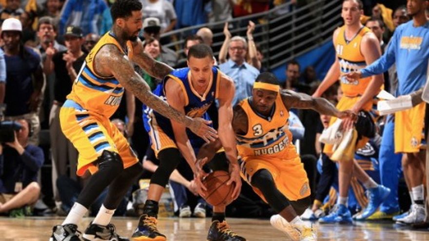Andre Miller registró su mayor cantidad de puntos en playoffs con 28 tantos, encestó en una excelente jugada a 1,3 segundos del final y los Nuggets de Denver ganaron 97-95 el sábado en el primer partido de su serie de postemporada ante los Warriors de Golden State. Miller dejó atrás al novato Draymond Green, se elevó entre dos defensores bajo el aro y lanzó el balón hacia el tablero en un disparo de derecha. Stephen Curry todavía tuvo tiempo de realizar un desesperado tiro de tres puntos que no estuvo ni cerca mientras el reloj de juego expiraba y los Nuggets festejaban su 24to triunfo consecutivo en el Pepsi Center. Miller anotó 18 en un frenético último cuarto. El segundo duelo de la serie está programado para el martes en el Pepsi Center, donde los Nuggets registraron una foja de 38-3 en la temporada regular —el mejor desempeño en casa de un equipo de la NBA en la campaña.