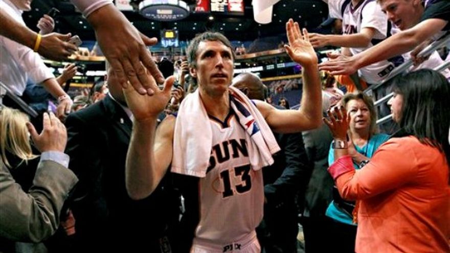 El base Steve Nash, dos veces nombrado el Jugador Más Valioso, se incorporará a los Lakers de Los Ángeles, el equipo rival de la División del Pacífico, al que doblegó apenas en contadas ocasiones durante las ocho campañas que estuvo con los Suns de Phoenix. A petición de Nash, los Lakers y los Suns concertaron un acuerdo de contratación y canje, después de que Los Ángeles utilizó la excepción del traspaso que se les concedió cuando enviaron a Lamar Odom a Dallas para facilitar la operación. Nash, de 38 años, que jugó las últimas ocho campañas con los Suns, era agente libre, pero se necesitaba un esquema de contratación y canje para que los Lakers pudieran llevárselo. El jugador aceptó un contrato de tres temporadas por 27 millones de dólares. Bill Duffy, representante de Nash, dijo que el acuerdo fue concretado el miércoles alrededor de las seis de la tarde, hora del Pacífico en Estados Unidos (0100 GMT del jueves). Según un comunicado que difundió el representante, Nash dijo que después de que él y los Suns acordaran separarse, él acudió de nuevo al equipo para solicitarle este tipo de transferencia con Los Angeles "Es muy importante para mí estar cerca de mis hijos y mi familia" que vive en Phoenix, dijo el canadiense. "Los Suns estaban muy nerviosos y no querían hacerlo", agregó Nash. "Afortunadamente para mí, reconsideraron. Vieron que podían conseguir activos para el equipo que los harían mejores, activos que de otra manera no tendrían y tenía sentido para ellos hacer una operación que contribuyera a la mejora del conjunto". Los Suns habían tenido conversaciones para un acuerdo similar con Nueva York y se les presentó una oferta lucrativa de un agente libre desde Toronto. Nash nunca disputó la final de la NBA. Terminó último en la final de la Conferencia del Oeste contra los Lakers en 2010, cuando los Suns perdieron en seis encuentros y Los Ángeles fueron a la postre campeones de la NBA.