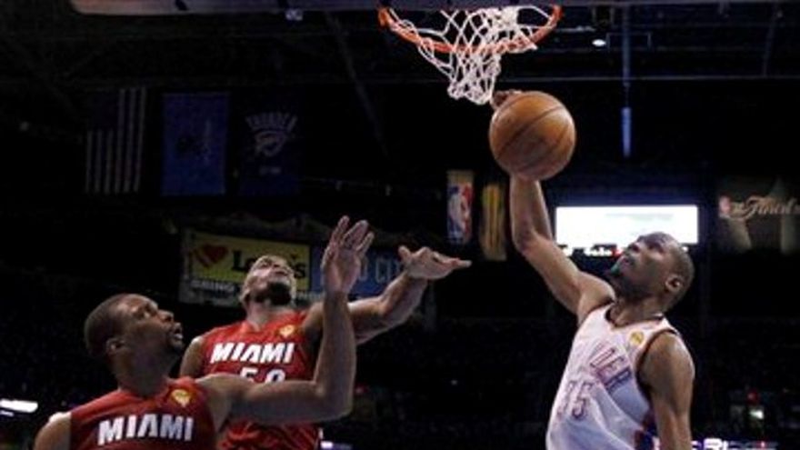 Kevin Durant le mostró a LeBron James cómo jugar el último cuarto de una final de la NBA. Kevin Durant anotó 17 de sus 36 puntos en otro período final de pesadilla para James y su equipo. Así encabezó la tormenta con la que el Thunder apabulló al Heat y le dio a Oklahoma City una victoria por 105-94 sobre Miami, con lo que tomó la ventaja el martes tras el primer partido. Durant se juntó con Russell Westbrook para superar al Heat en la segunda mitad. Durant golpeó primero en su duelo con James, quien tuvo siete puntos en el último cuarto y fue incapaz de detener al campeón anotador de la liga en tres ocasiones. Westbrook se recuperó de un comienzo con mala puntería para terminar con 27 puntos, 11 asistencias y ocho rebotes para el Thunder, y encabezó un sólido final en el tercer período que le dio al Thunder la ventaja. Durant se hizo cargo desde ese momento. Encestó de casi todas las formas posibles, embocó 12 de sus 20 tiros de campo y capturó ocho rebotes. El y Westbrook superaron por 41-40 al Heat en los dos últimos cuartos, con lo que mostraron que tal vez en esta ocasión va a ser la ofensiva la que gane campeonatos. James totalizó 30 puntos, su mejor marca en cualquiera de sus 11 partidos en finales, pero sólo anotó una canasta en los primeros 8:15 minutos del cuarto período, cuando el Thunder tomó el control de un partido que estuvo perdiendo durante la mayor parte de los tres primeros cuartos. James promedió tan sólo tres puntos en los últimos períodos durante la derrota en seis partidos del Heat frente a Dallas el año pasado, con lo que asumió casi toda la culpa por el fracaso de Miami en la final. Tuvo un buen desempeño en el juego del martes, sólo que Durant fue mejor. Y cuando los aficionados coreaban "¡MVP! ¡MVP!" al final del juego, en alusión al Jugador Más Valioso, no hablaban de James, el hombre que ganó el premio de la temporada regular. Se referían a Durant, quien compite contra James por su primer anillo de campeón, y quizás el título de mejor jugador. El segundo juego está previsto para el jueves por la noche en Oklahoma City. Dwyane Wade anotó 19 puntos, pero acertó sólo siete de sus 19 intentos para el Heat, mientras Shane Battier tuvo una inusual colaboración ofensiva al encestar 17 tantos, su mejor marca en esta postemporada. El Thunder alcanzó una foja de 9-0 en su estadio en los playoffs. Thabo Sefolosha ayudó a defender frente a James durante la remontada del Thunder, para quitarle algo de la carga a Durant a fin de que se concentrara en anotar. Y ahora mismo, nadie lo hace mejor.