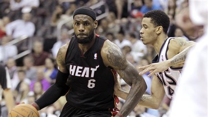 LeBron James convirtió los últimos 17 puntos de Miami en una sensacional actuación individual y el Heat sacó el lunes una victoria de 101-98 sobre los Nets de Nueva Jersey. En un partido en que el Heat nunca estuvo adelante sino hasta los 51 segundos finales, James llevó a Miami a su 10mo triunfo seguido sobre los Nets. Con Dwyane Wade en descanso, James convirtió esos 17 puntos en los últimos 4:48 minutos y terminó con 37. Chris Bosh tuvo 22 puntos y 15 rebotes para el Heat en una actuación que mantuvo a flote a Miami en la primera parte del último cuarto hasta que James surgió promediaba el período y convirtió lo que parecía una segura derrota en una victoria sorpresiva. Kris Humphries anotó 29 puntos para unos Nets que echaron de menos a su base Deron Williams.