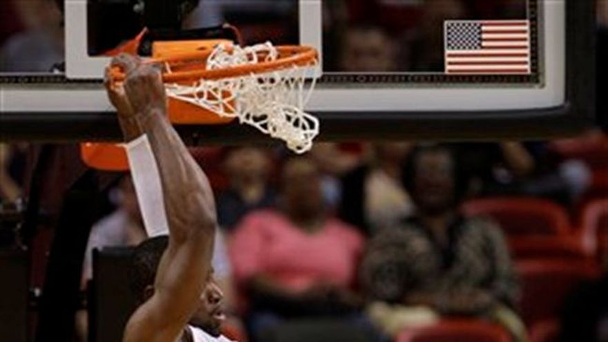LeBron James anotó 33 puntos, Dwyane Wade contribuyó con 32 y el Heat de Miami nunca estuvo en desventaja el sábado al derrotar por 103-98 a los Nuggets de Denver. Chris Bosh acumuló su quinto partido consecutivo con dos dígitos en dos departamentos estadísticos al encestar 18 puntos y recuperar 11 rebotes. Sin embargo, el Heat sufrió una baja sensible luego que su armador titular Mario Chalmers fue sacado de la cancha en camilla a finales del primer período con lo que fue diagnosticado preliminarmente como una torcedura en la rodilla derecha. Mike Bibby, el otro armador real en la nómina de Miami anotó 14 puntos. J.R. Smith agregó 27 unidades y el italiano Danilo Gallinari encestó 23 puntos para Denver, que terminó con foja de 0-2 en dos partidos consecutivos en la Florida. Por los Nuggets, el brasileño Nené Hilário anotó 10 puntos, recuperó dos rebotes, dio dos asistencias, tuvo cuatro faltas, robó dos balones y bloqueó un tiro en 29 minutos de juego.