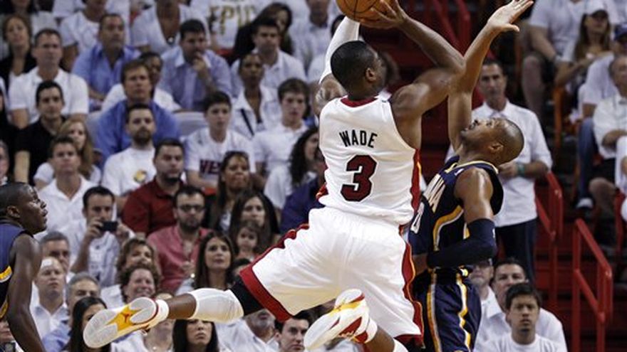 LeBron James anotó 30 puntos, Dwyane Wade agregó 28 y el Heat de Miami se colocó a un triunfo de otro boleto a la final de la Conferencia Este con una victoria el martes de 115-83 sobre unos Pacers de Indiana con lesiones repentinas. James agregó 10 rebotes y ocho asistencias. Shane Battier anotó 13 y Mario Chalmers tuvo ocho puntos y capturó 11 tableros. El Heat encabeza 3-2 las semifinales del Este a ganar cuatro de siete. El sexto encuentro se disputará el jueves en Indiana. Paul George metió 11 puntos para los Pacers, mientras que el alero Danny Granger y el ala-pívot David West agregaron 10 unidades cada uno. Granger dejó la cancha con una torcedura en el tobillo izquierdo en el tercer período, y West también salió del encuentro con un problema en la rodilla izquierda al final de ese período. Miami tuvo una efectividad del 61%, un récord de la franquicia en playoffs.