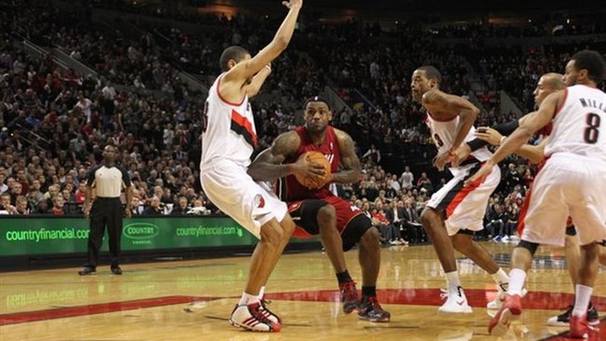 LeBron James anotó 44 puntos, recuperó 13 rebotes y repartió seis asistencias mientras que Dwyane Wade agregó 34 puntos y ocho rebotes para que ambos llevaran al Heat de Miami a derrotar el domingo por 107-100 en período de prórroga a los Trail Blazers de Portland. Fue la 13ra victoria consecutiva como visitantes para el Heat. James encestó dos triples y acertó un par de tiros libres en el período adicional para Miami (30-9) que ha ganado 21 de sus últimos 22 partidos después de un comienzo incierto de la campaña. Chris Bosh contribuyó con 18 puntos y ocho rebotes y los tres grandes jugadores se combinaron para encestar casi todos, salvo 11 puntos de Miami. LaMarcus Aldridge anotó 31 puntos, tuvo 14 rebotes y siete asistencias para los Trail Blazers (20-18), que vieron romperse una seguidilla de ocho victorias consecutivas de locales. Nicolas Batum agregó 22 puntos y Wesley Matthews tuvo 14 para Portland. Por el Heat el puertorriqueño Carlos Arroyo anoto dos puntos, tuvo dos rebotes tres asistencias, una falta, robó un par de balones y perdió uno en 33:10 minutos de juego.