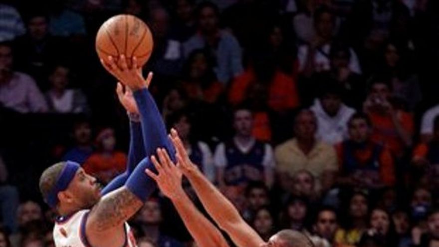 Carmelo Anthony anotó 41 puntos, Amare Stoudemire añadió 20 con 10 rebotes en su regreso después de cortarse la mano para que los Knicks de Nueva York pusieran fin a una racha de 13 partidos perdidos en postemporada al vencer el domingo 89-87 al Heat de Miami en en el cuarto duelo de la serie de primera ronda. La cadena de reveses de los Knicks es la peor en la historia de los playoffs de la NBA. Esta es su primera victoria en postemporada desde el 29 de abril de 2001. Anthony quebró el empate cuando encestó un triple a 54.5 segundos del final. Los Knicks se sobrepusieron a otra grave lesión de uno de sus jugadores, esta vez de Baron Davis. Davis se dislocó la rótula derecha en el tercer periodo, justo cuando los Knicks se encontraban en una reacción que les metió en el partido tras una pésima primera mitad. LeBron James anotó 27 puntos para Heat, que tratará de recuperarse en el quinto partido el miércoles en casa.