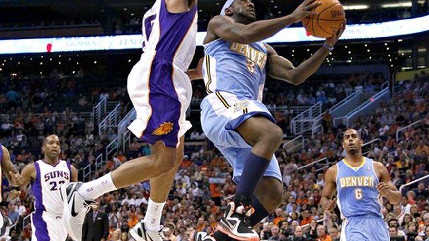 Ty Lawson encestó sus cinco disparos de tres puntos y terminó con 29 puntos y 10 asistencias para llevar a Denver a una victoria de 118-107 sobre los Suns de Phoenix y asegurar un lugar en postemporada para los Nuggets. Los Suns cayeron a medio juego detrás de Utah por el octavo y último puesto para playoffs en la Conferencia del Oeste. El Jazz recibe en casa a Orlando por la noche. Phoenix enfrentará a Utah el martes y podría representar un partido que defina el duelo con el Jazz por el puesto. Steve Nash aportó 13 asistencias por los Suns, nueve en el primer cuarto, y superó a Oscar Robertson en el quinto lugar de la lista de asistencias en la historia de la NBA. Los Suns perdieron a Channing Frye por una lesión de hombro en el segundo cuarto. Shannon Brown anotó 28 puntos por Phoenix, entre ellos seis tiros de tres puntos, la mejor marca de su carrera.