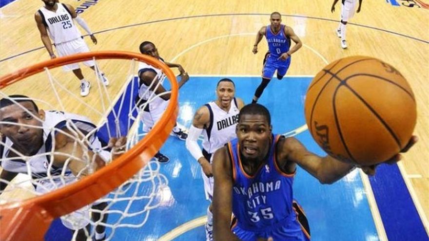 Kevin Durant encontró el miércoles finalmente su toque de precisión a la hora de tirar en la postemporada para que el Thunder de Oklahoma City tuviera un buen arranque y sin perder jamás la delantera venciera 95-79 a los Mavericks de Dallas para ponerse 3-0 en la serie sobre los campeones defensores. Luego de dos partidos cerrados en casa, el joven equipo de Oklahoma City supero ampliamente en el tercer encuentro como visitante. Con una victoria más el Thunder podría cerrar rápidamente la primera ronda de playoffs. El cuarto partido será el sábado en Dallas. Durant finalizó con 31 puntos encestando 11 de 15. El tres veces campeón anotador de la liga había encestado 15 de 44 en los dos primeros partidos de la serie, aunque tuvo consiguió la canasta de la victoria con 1,5 segundos en el primer encuentro. Russell Westbrook sumó 20 puntos para el Thunder. Dirk Nowitzki anotó 17 puntos para encabezar a Dallas.