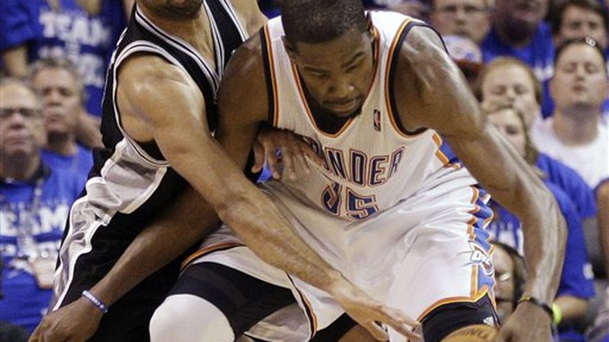 Kevin Durant anotó 18 de sus 36 puntos en los últimos siete minutos del partido, que resultaron electrizantes, y el Thunder de Oklahoma City igualó la serie final de la Conferencia Oeste a dos triunfos por bando, al vencer el sábado por 109-103 a los Spurs de San Antonio. Serge Ibaka agregó 26 unidades, la mayor cifra en su carrera, por el Thunder. Tras ver la ventaja de 15 puntos de su equipo reducida a cuatro, Durant se encargó de las acciones a la mitad del último período para anotar las 16 unidades del Thunder durante un lapso de sólo cinco minutos y poner a los Spurs en un aprieto. Russell Westbrook, su compañero del Juego de Estrellas, se limitó a siete puntos, y Durant realizó casi todo el daño hacia el final del encuentro, para enviar la serie de regreso a San Antonio, empatada para el quinto juego, el lunes por la noche. El tres veces campeón anotador acertó tres tiros en suspensión consecutivos, el último de ellos tras chocar con Tony Parker, para provocar una falta y la jugada de tres puntos. Seguidamente atacó el aro en las tres canastas siguientes, yendo de nuevo a la línea de tiros libres cuando le cometieron una falta. Durant encestó otra tras saliendo de una pantalla de Westbrook, la última canasta en su racha personal — y los Spurs estaban aún a corta distancia. El novato Kawhi Leonard tuvo dos canastas de tres y San Antonio estaba debajo apenas 102-96 a 1:24 del final. Los Spurs consiguieron mantener la pelota fuera de las manos de Durant en la siguiente posesión del Thunder, pero el astro tuvo la asistencia para la canasta de larga distancia de Harden que aumentó la ventaja a nueve puntos. Durant acertó dos tiros libres en el último minuto, para sellar el triunfo. Oklahoma City trata de convertirse en el 15 equipo en la historia de la NBA en sobreponerse a un déficit de 0-2 en una serie a siete juegos, y el octavo desde el 2004. Tim Duncan anotó 21 puntos por San Antonio, que había ganado 20 partidos seguidos antes de perder el tercer duelo. El argentino Manu Ginóbili sumó 13 unidades en 24:43 minutos. Acertó cuatro de siete tiros de campo y de 3-3 en tiros libres; tuvo cuatro asistencias y seis faltas.