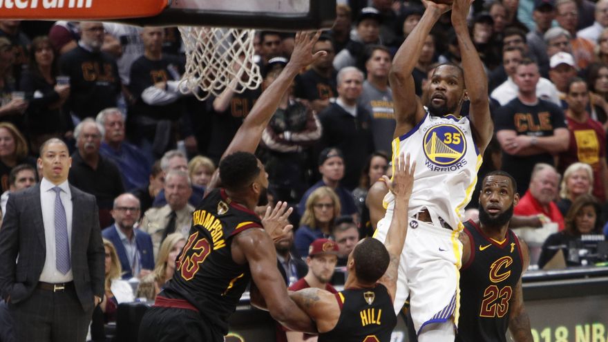 Otro abrazo (72) en el marcador llegó faltando cinco minutos para terminar el tercero por triples de Smith, por los Cavs, y Durant, por los campeones.