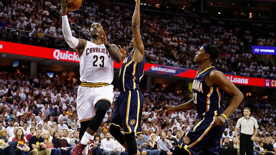El alero LeBron James anotó dos tiros libres a falta de 1:16 minutos para el final del tiempo reglamentario y los Cavaliers de Cleveland vencieron hoy 109-108 a los Pacers de Indiana en el primer juego de la serie final de la Conferencia Este.