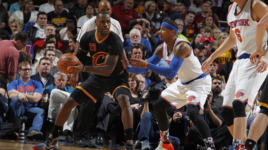 El alero Carmelo Anthony aportó 17 puntos y el ala-pívot novato latvio Kristaps Porzingis consiguió 13 por los Knicks, que estuvieron empatados a 75 en el cuarto periodo, antes de que James hiciese valer su condición de estrella.