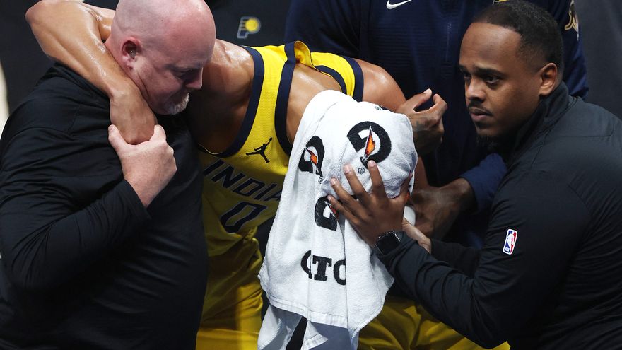 Haliburton comenzó la noche a un ritmo endiablado, anotando 9 puntos, con tres triples casi consecutivos, antes de desplomarse sobre la cancha cuando intentaba driblar a su defensor.