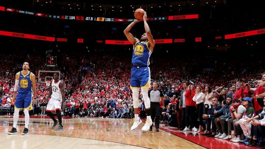 Los Golden State Warriors, con un parcial inicial de 18-0 en el tercer cuarto y un triple de Andre Iguodala a falta de 5,9 segundos, remontaron 109-104 un partido que se les había puesto muy cuesta arriba e igualaron 1-1 la Final de la NBA frente a los Raptors en Toronto.