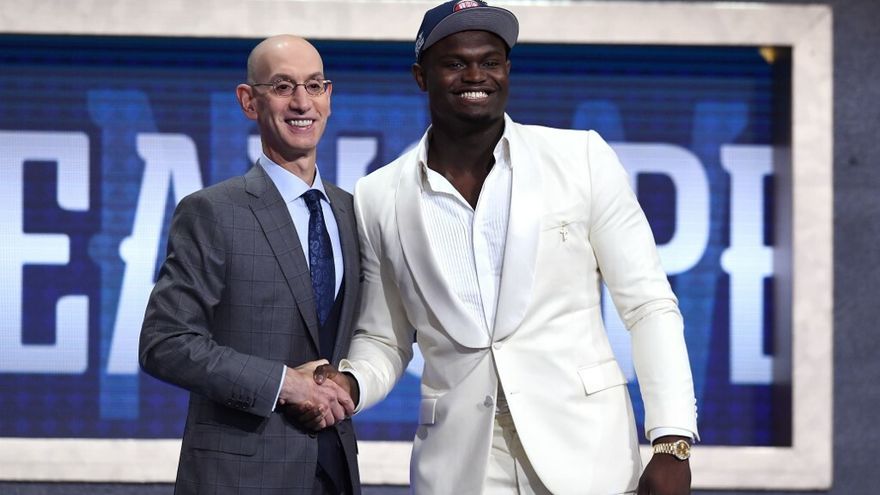 Ataviado con un traje íntegramente blanco, Zion subió al atril para recoger la gorra de su nuevo equipo que le entregó el comisionado de la liga Adam Silver en el Barclays Center de Brooklyn.