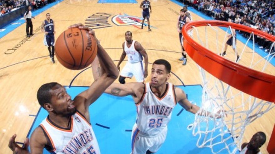 OKLAHOMA CITY- Kevin Durant tuvo 31 puntos, ocho rebotes y ocho asistencias, Serge Ibaka agregó 21 unidades y 12 balones atrapados ante los tableros, y el Oklahoma City Thunder continuó el lunes su dominio en casa con una victoria de 86-77 sobre los Memphis Grizzlies. Oklahoma City (39-11) vio frenada una racha de 10 victorias al hilo el sábado en Washington, pero mejoró a 21-3 en casa al ganar su séptimo consecutivo en la Chesapeake Energy Arena. Zach Randolph anotó 13 puntos y atrapó 13 rebotes, y Marc Gasol añadió 13 puntos para los Grizzlies (26-21), que cayeron apenas por segunda vez en 13 partidos. Memphis venía de ganar seis en fila.